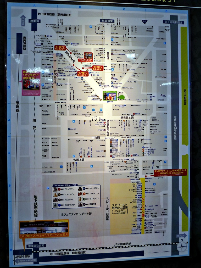這裡有一張通天閣附近的地圖,而且有標註出筋肉人相關的商店在哪裡,可以一起去逛逛唷。