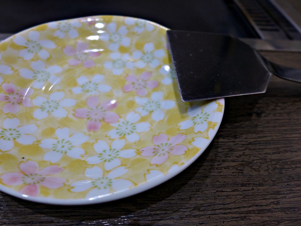 桌上每個人都有一份餐具,有小盤子和一隻小鐵鏟,鏟起來後再用筷子吃。