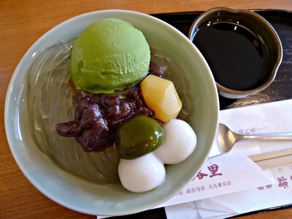 這是類似葛粉那種粉條之類的東西,上面有一團抹茶冰淇淋、一團紅豆泥、幾顆湯圓,還有一顆好像是紅薯吧。