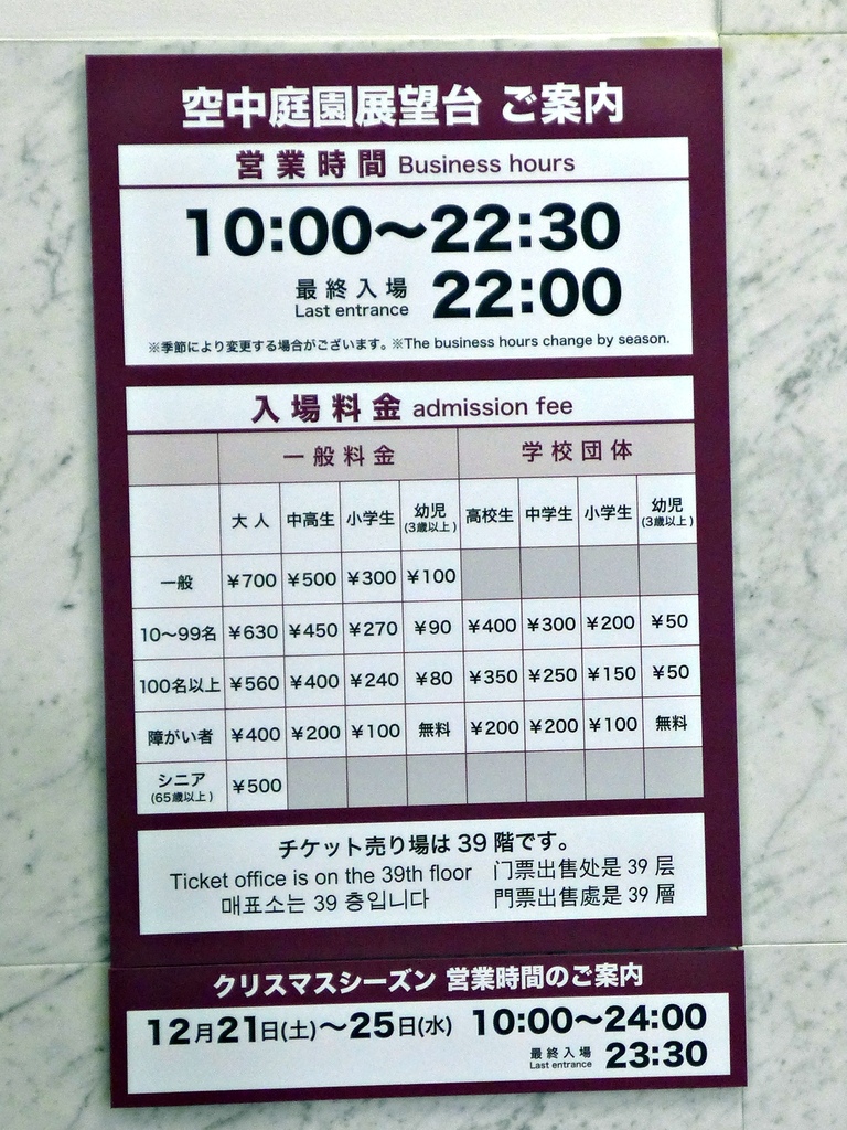 電梯搭到39樓買票,一般成人的入場票價是700元日幣,