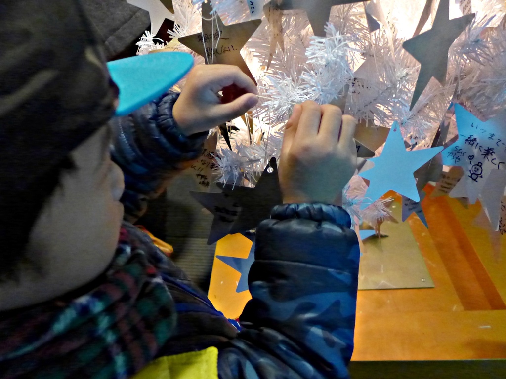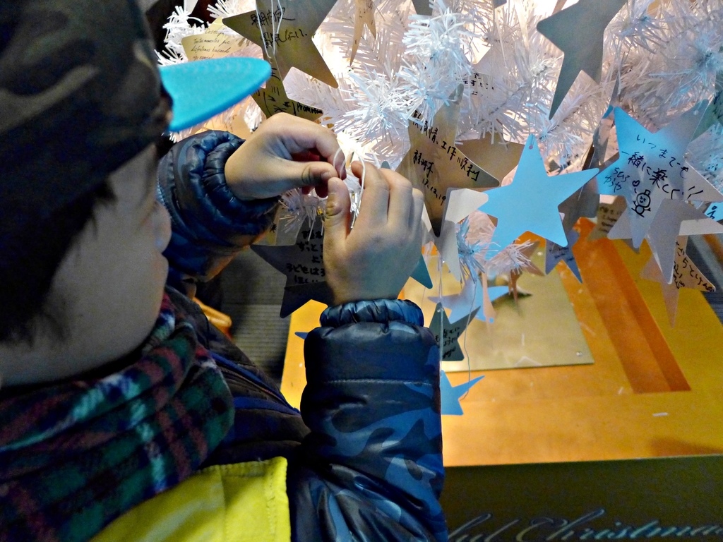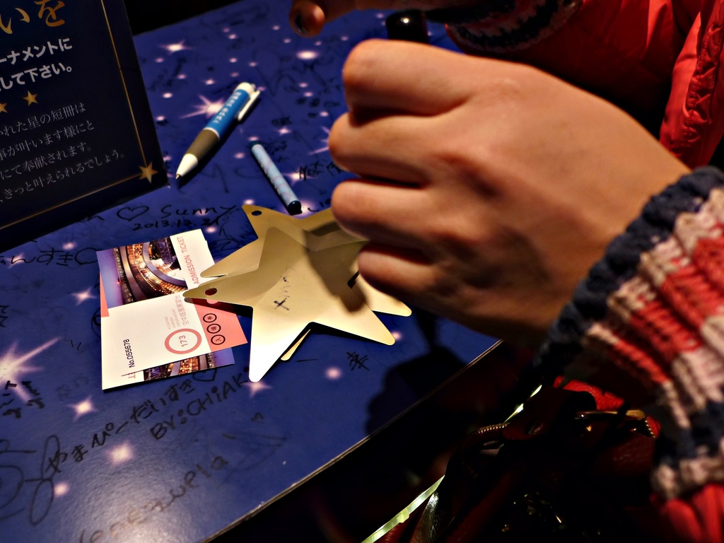 上面掛的那許多星星都是人們寫的許願卡耶!所以我們當然也入境隨俗的來寫一張掛上去!