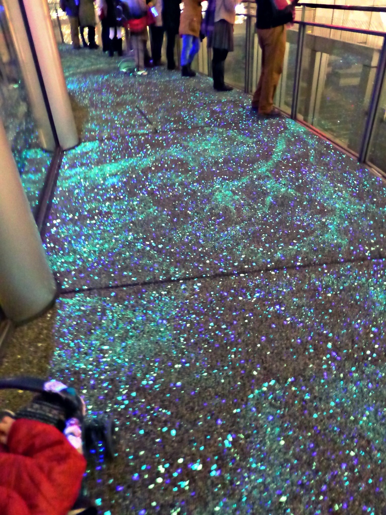 這是我們搭到三樓要走去轉另一架電梯的時候拍的,可以看到外面廣場上的大聖誕樹,還有牆上投影的雪人!好可愛。