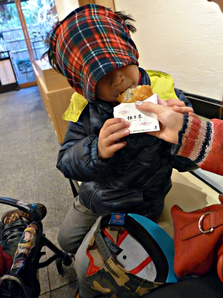 他們賣的是麵包類的點心、還有醬油團子等等,我們看人滿多就跟著進去買來吃囉!順便休息一下歇歇腳,呵呵。