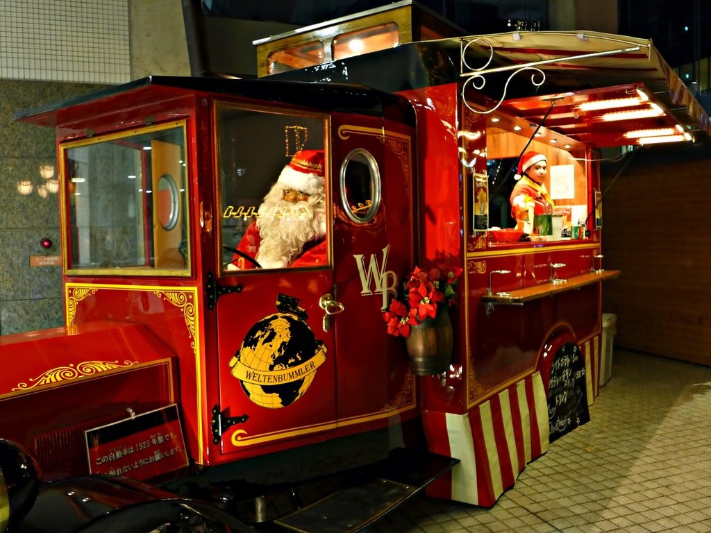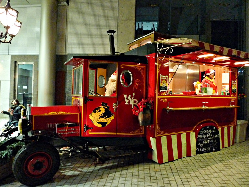 這是一個攤位,很有創意也很大成本的用一輛車子的造型、而且裡面還有一個聖誕老公公當駕駛耶!