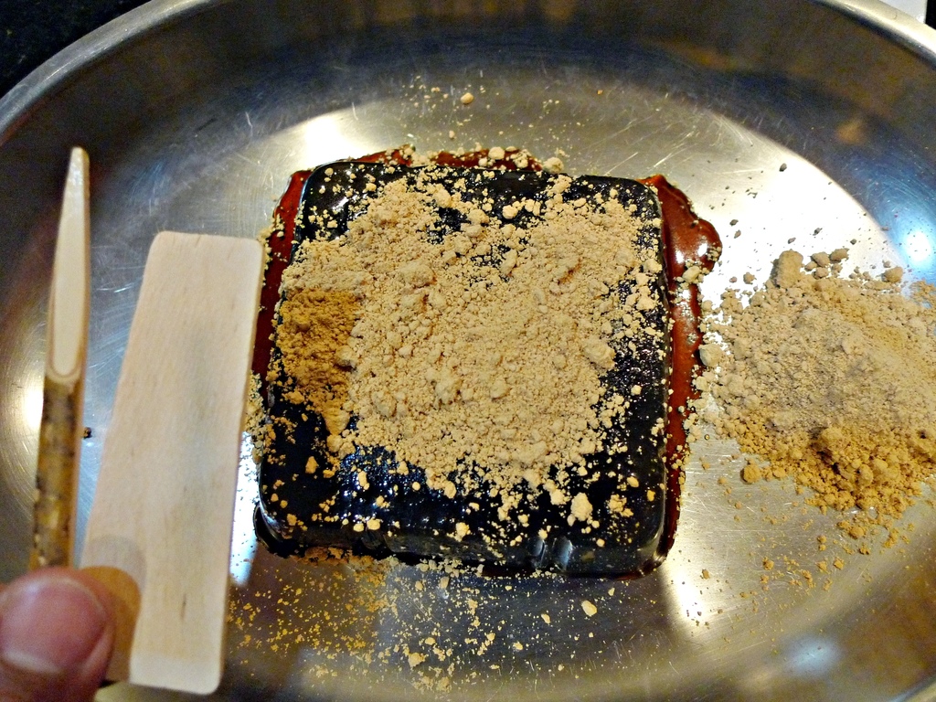 淋上黑糖的醬汁再灑上那一包粉,然後用附在包裝裡的木片切割成一小塊一小塊,再用小木棍插著吃。