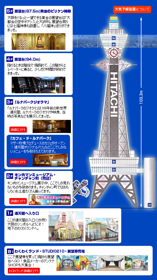 這是從官網上面抓下來的通天閣樓面介紹,現在世界上比通天閣還高的高塔太多了!我自己就去過好幾個了。
