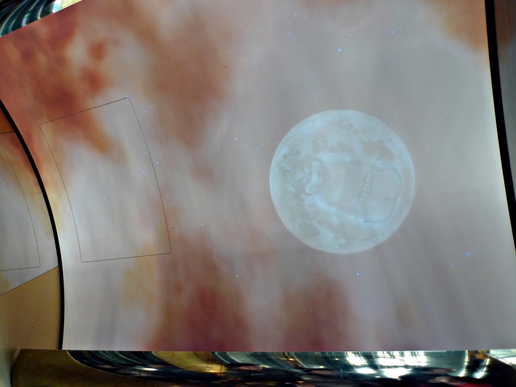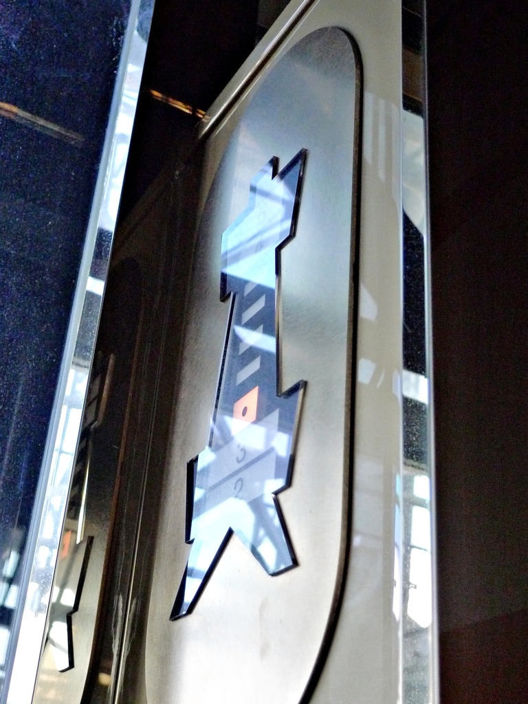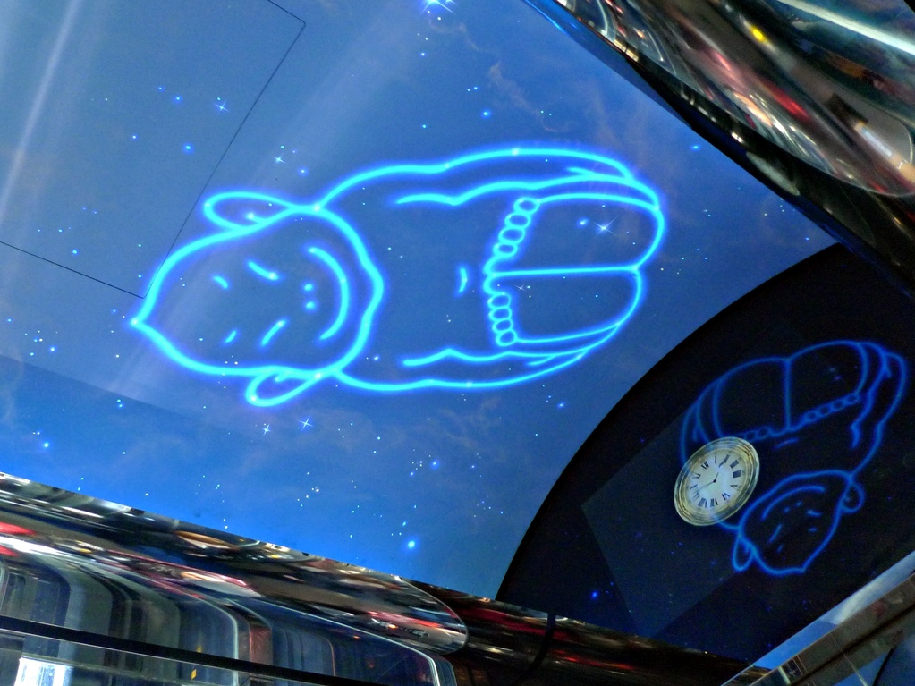 逛完頂樓要下樓時搭了另一部電梯,那一座電梯的天花板則是黃色系的投影,有一顆星球、上面也有一尊BILLIKEN,呵呵。