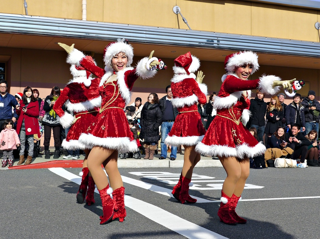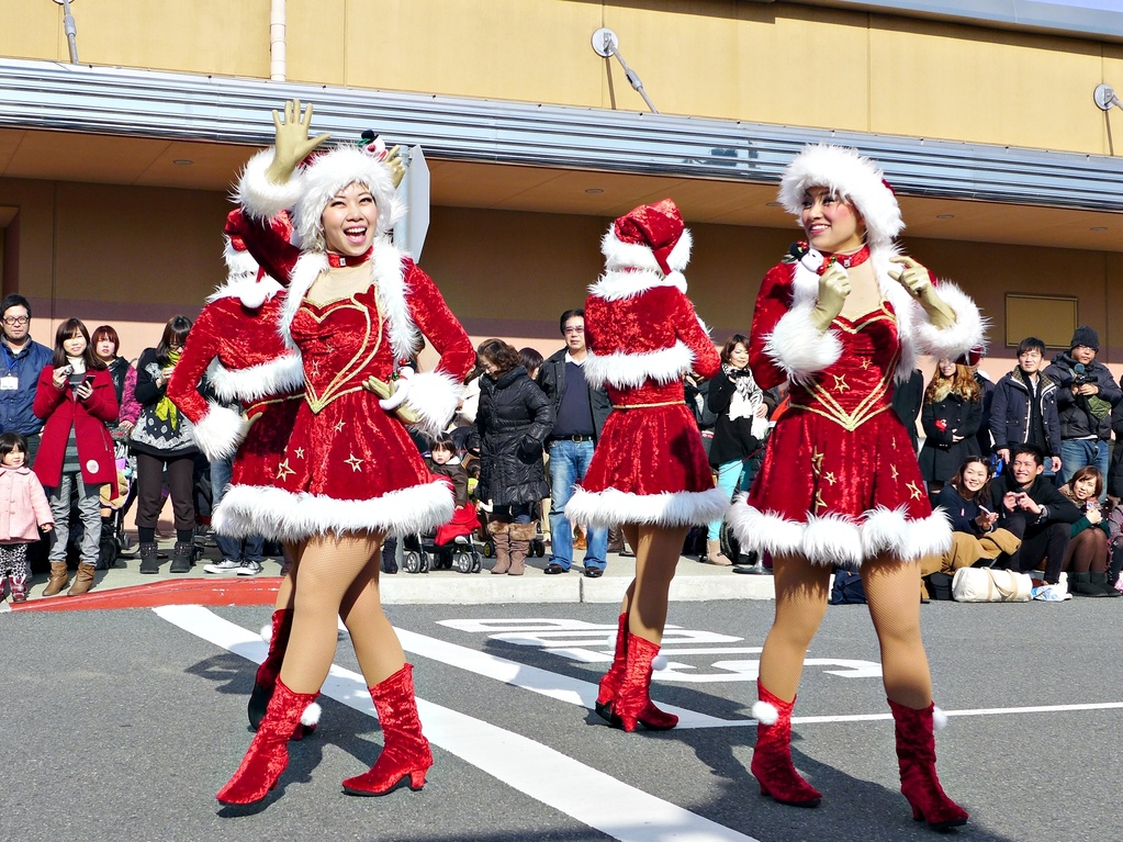 很歡樂的一群穿著聖誕服裝的小姐們、一邊跳舞一邊出場。