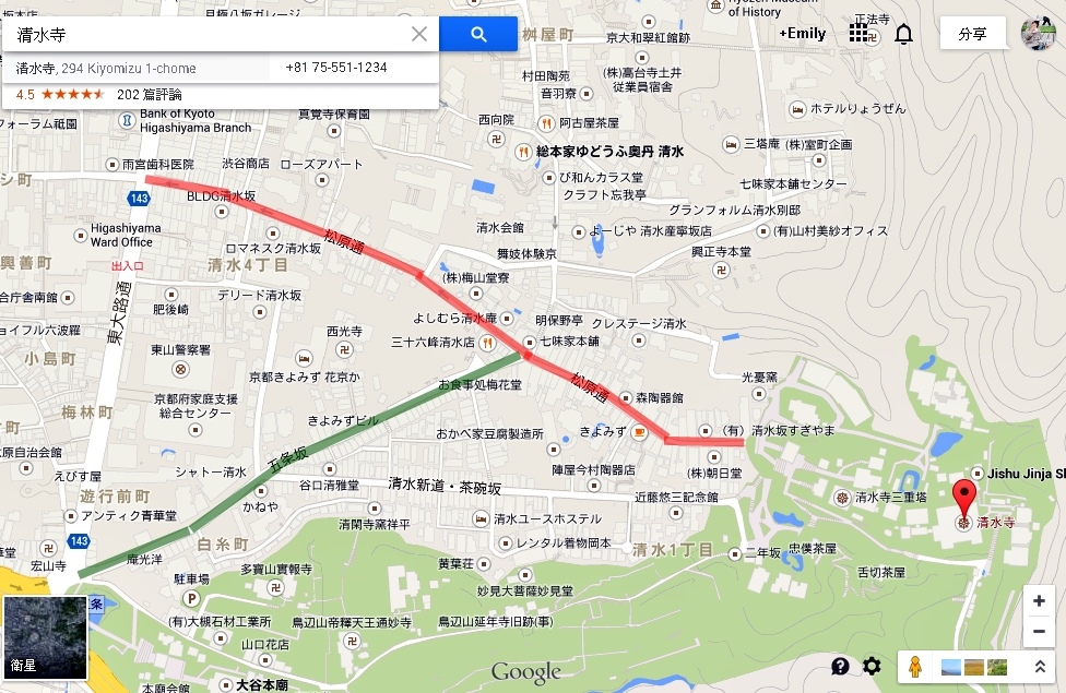所以還是選擇在清水道下車了,呵,下圖紅色的就是我們走的路線,綠色則是從五条坂走的路線。