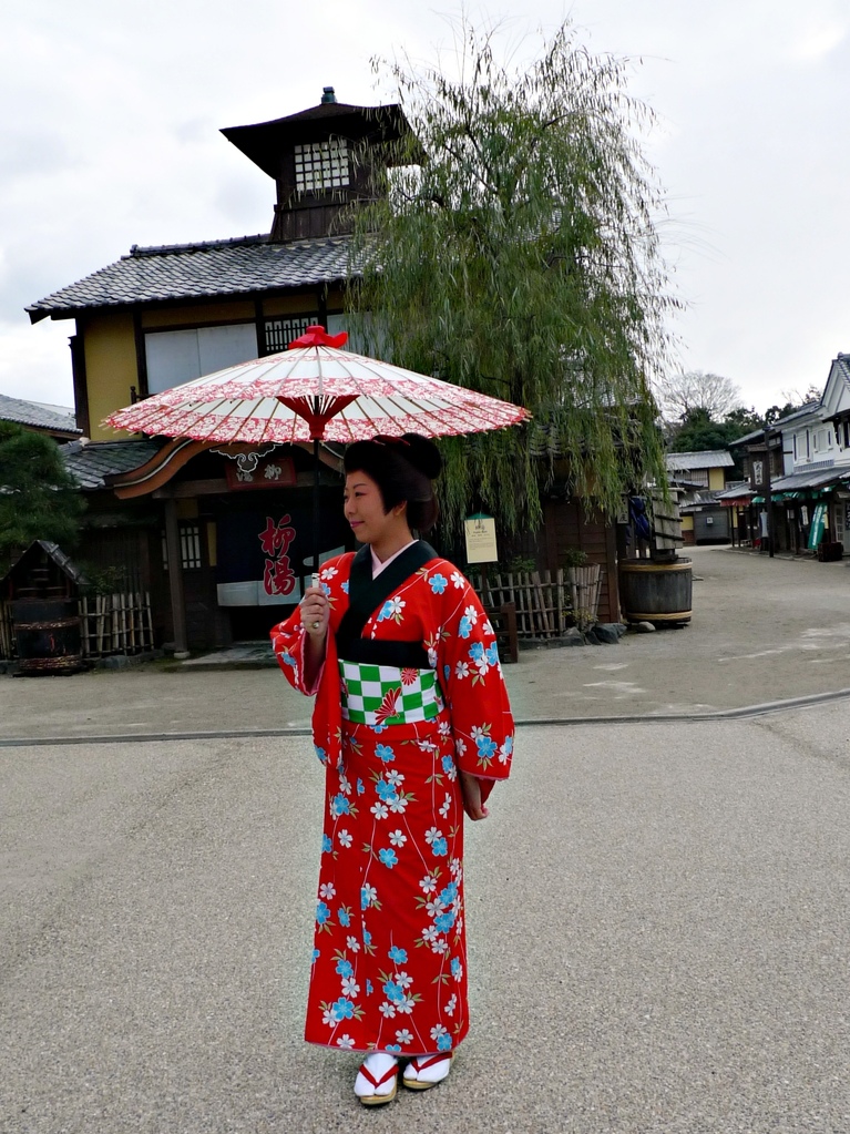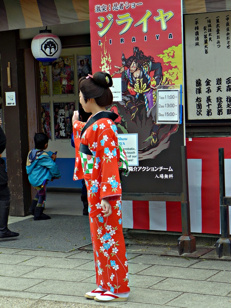 剛好看到這一位很漂亮的和服女子在招呼路邊的遊客,原來她是在告訴大家:表演快要開始了!大家可以進去看唷。