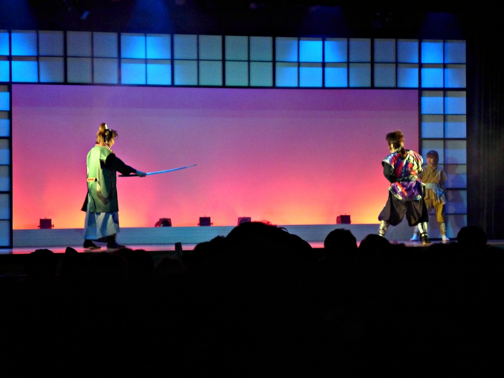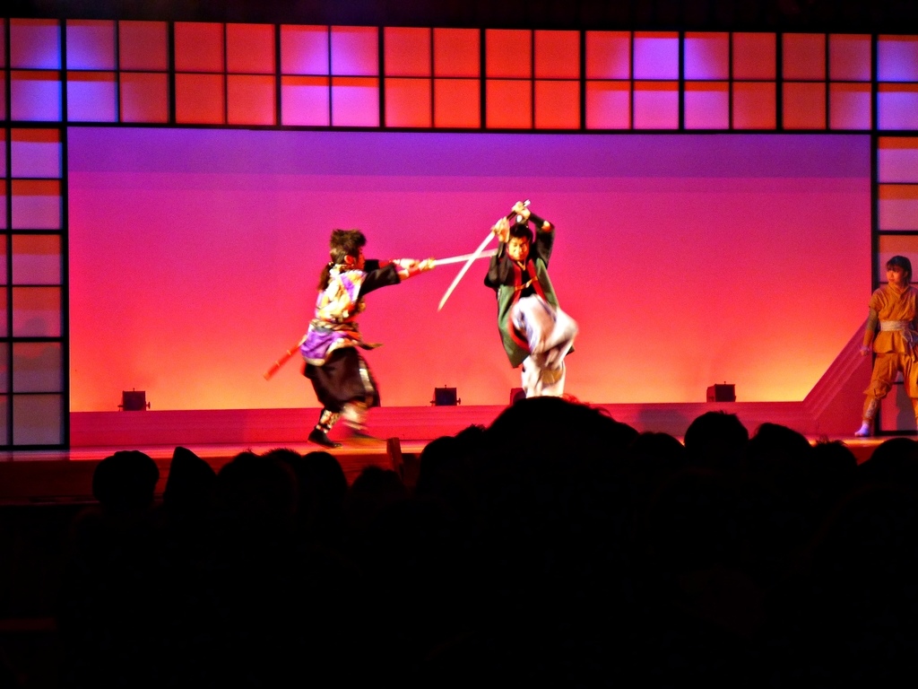 這個表演是忍者秀,有一些很逼真的武術打鬥表演!一開始就有忍者從兩旁的二樓滑下來,很精采!