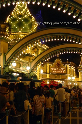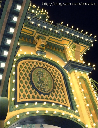 這是整個遊樂設施的外面,晚上比白天更耀眼,因為整區都點滿了亮晶晶的小燈泡。