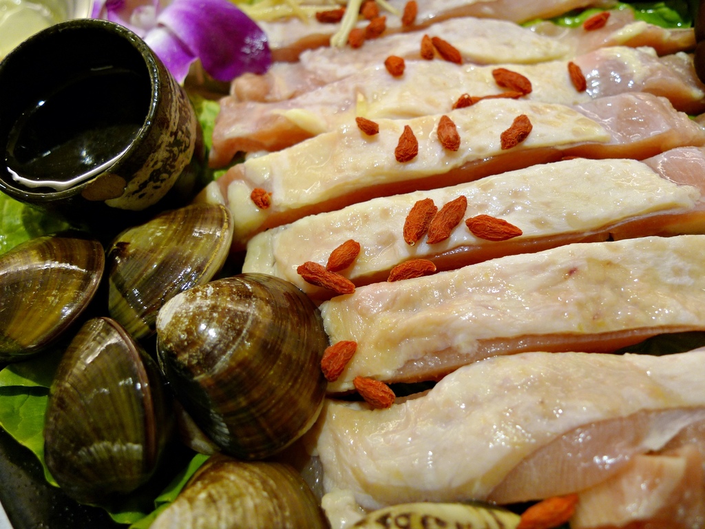 左邊那一個黑色的小杯子裡面裝的是酒,應該是米酒唷!可以倒進鍋裡一起煮,整個很補的感覺,好吃!