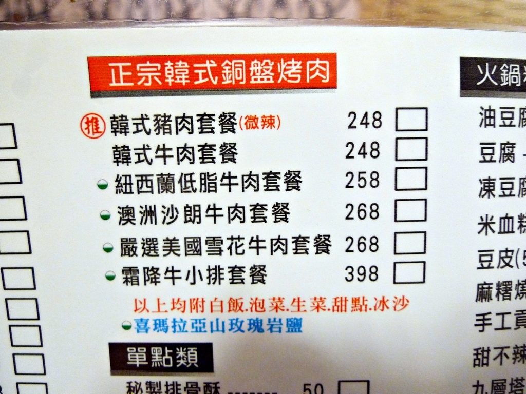 毛阿公點的是澳洲沙朗牛肉套餐,毛爸吃店家推薦的韓式豬肉套餐,我則是點紐西蘭低脂牛肉套餐。