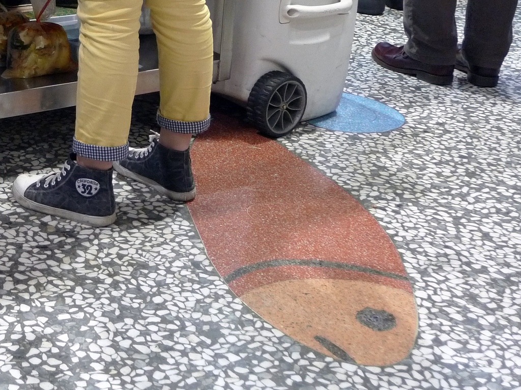 磨石子地板上居然還有鑲著魚的形狀,好酷唷。