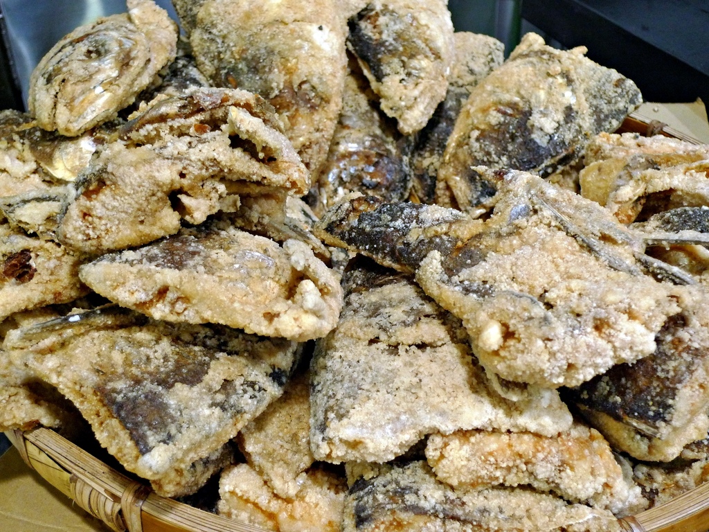 大鍋子旁邊有一大堆炸好的魚,那個大鍋子的尺寸也很驚人!很像早期那種灶耶,好大。