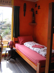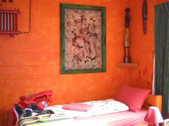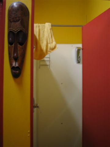 床單和牆壁都是彩度很高的亮色系,連暖氣系統的鐵條都漆成可愛的紅色,配上一些民俗風的掛畫和擺飾,感覺很好!
